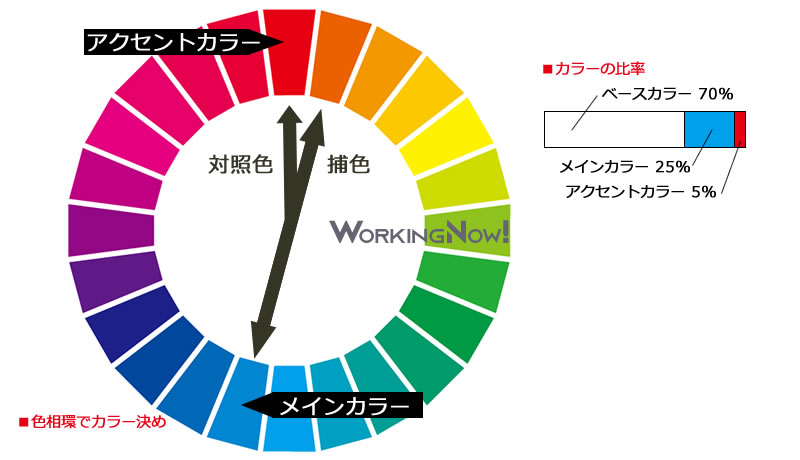 色を選定するにあたっては、メインカラーの対照色や捕色を使うと際立ちやすく感じられます。
