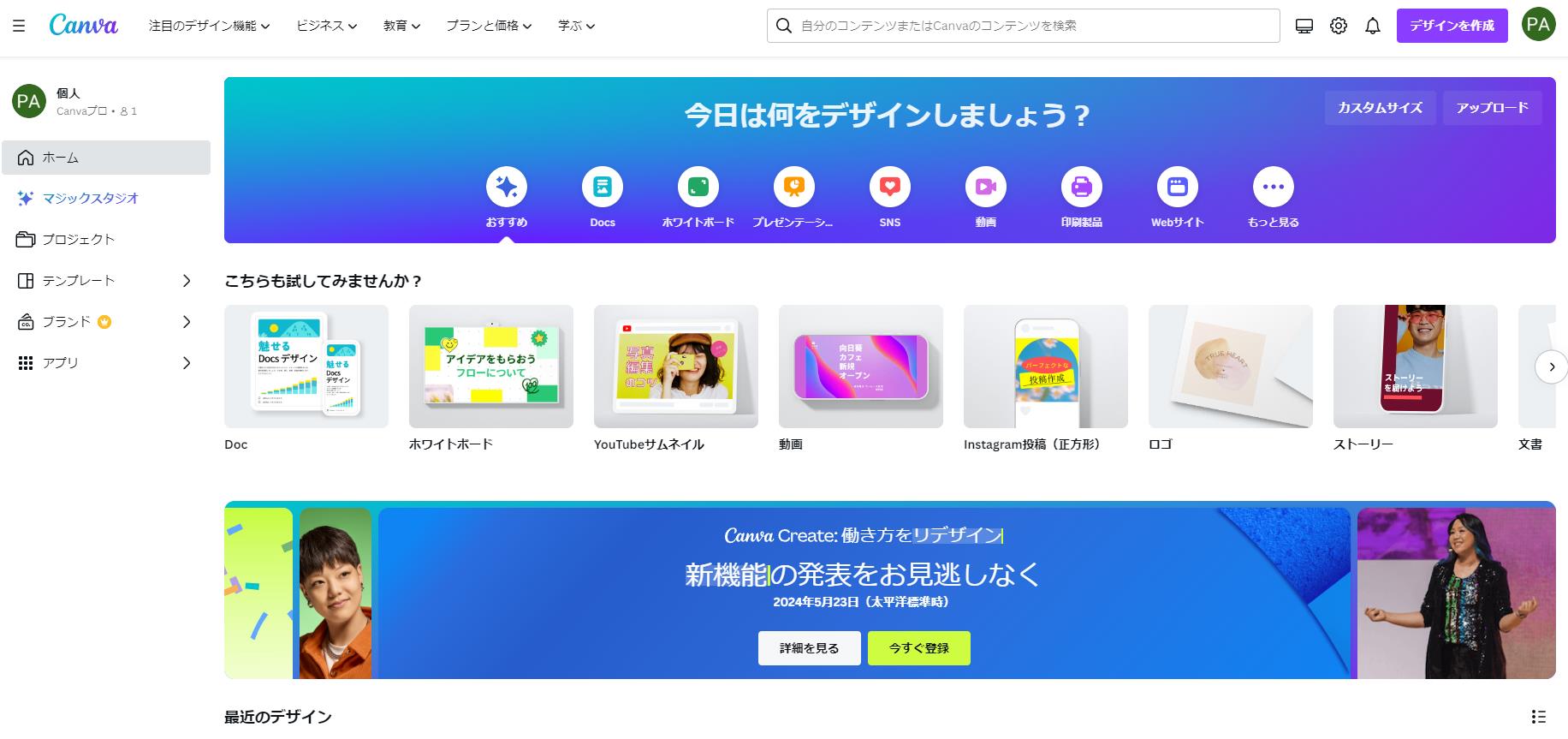 Canvaは絵心やデザインのノウハウを持たないような素人も簡単にプロっぽく美しいデザインを、直感的な操作で作成できる定額制のオンラインのグラフィックデザインツールです。