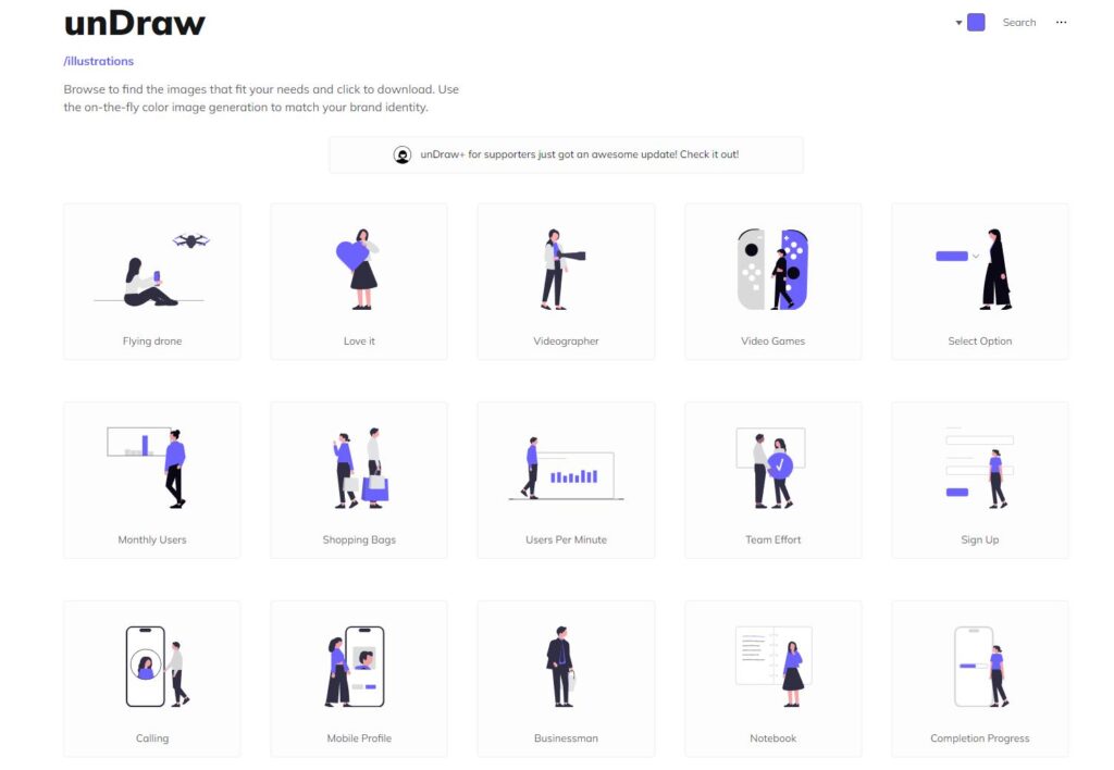 unDrawは英語のイラストフリー素材サイト。会員登録不要でダウンロード可能。