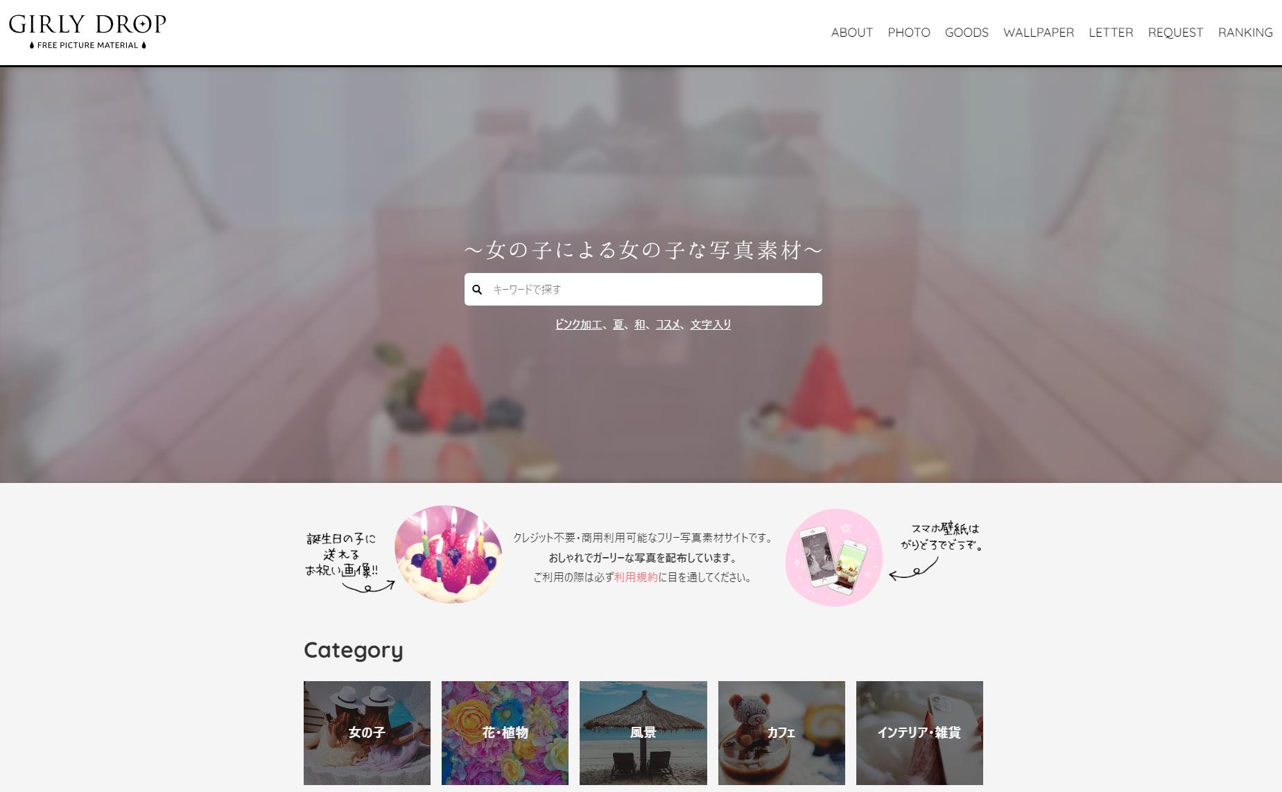カテゴリ分けも、女の子、花・植物、風景、カフェ、インテリア・雑貨、美容、ファッション、動物、イベント、誕生日に分類。女性向けのコンテンツ作りに重宝しそうなフリー素材サイト。