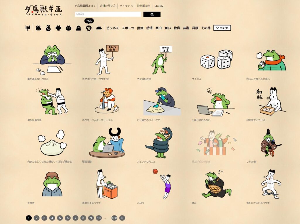 ダ鳥獣戯画はTOPECONHEROESダーヤマによる鳥獣人物戯画のベクターデータ化、カラー化のプロジェクトとして、日本最古の漫画ともいわれる鳥獣戯画をベクターデータ化したフリー素材サイト。