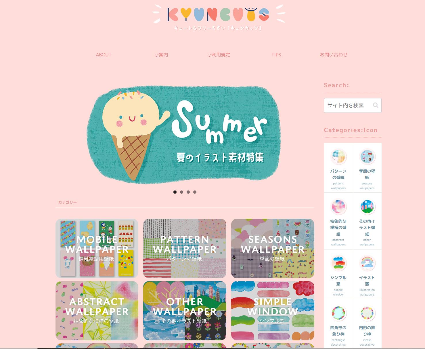 KyunCuts(キュンカッツ)はA3サイズの高解像度データの壁紙や飾り枠、タイトル用窓素材にイラスト素材が無料ダウンロードできるキュートを全面に出したフリー素材サイト。