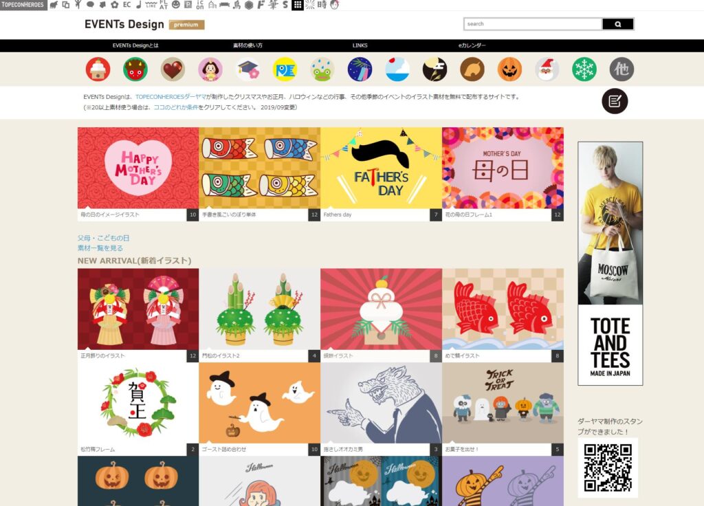 EVENTs DesignはTOPECONHEROESダーヤマが制作したクリスマスやお正月、ハロウィンなどの行事、その他季節のイベントのイラスト素材を無料で配布しているサイトです。
