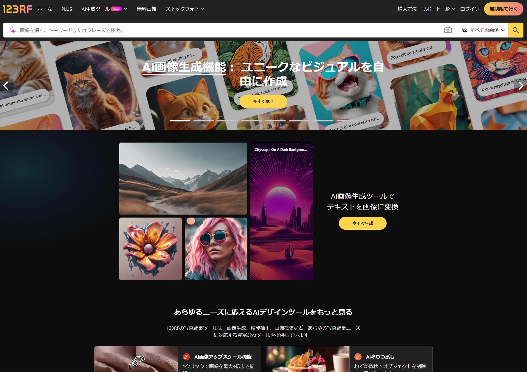 123RF(ワンツースリー・アールエフ)は2億点以上の画像とベクター画像や3D画像を提供すると共に、豊富なAIを駆使しだ編集ツールを使って画像を生み出すことができる画像素材サービス。