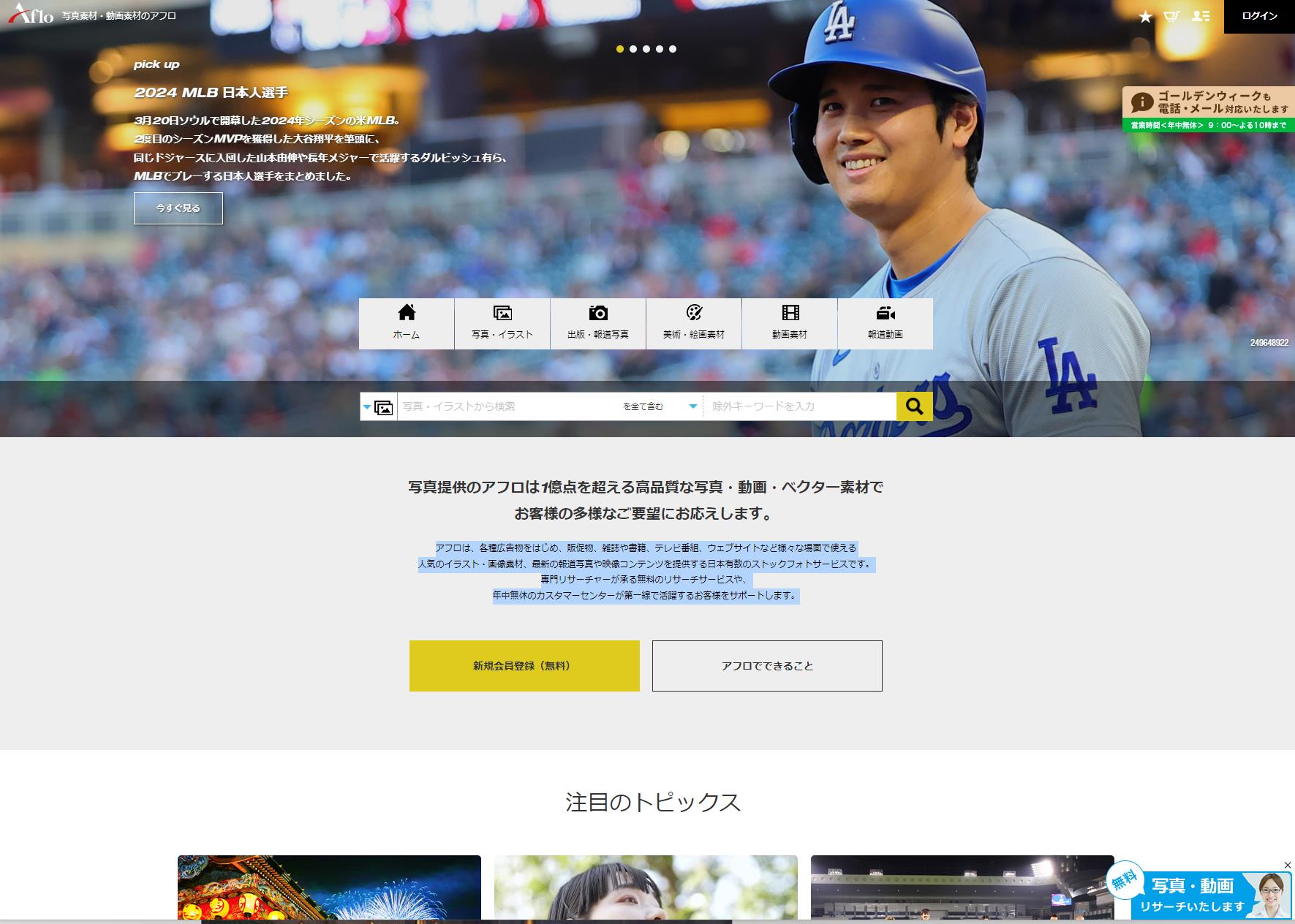 Aflo(アフロ)は、各種広告物をはじめ、販促物、雑誌や書籍、テレビ番組、ウェブサイトなど様々な場面で使えるイラストや画像素材を取り扱うサイト。報道写真や映像コンテンツを提供する日本有数のストックフォトサービスでもあります。専門リサーチャーが承る無料のリサーチサービスや、年中無休のカスタマーセンターを設けるなど、メディア向けな毛色が強いのも特長。
