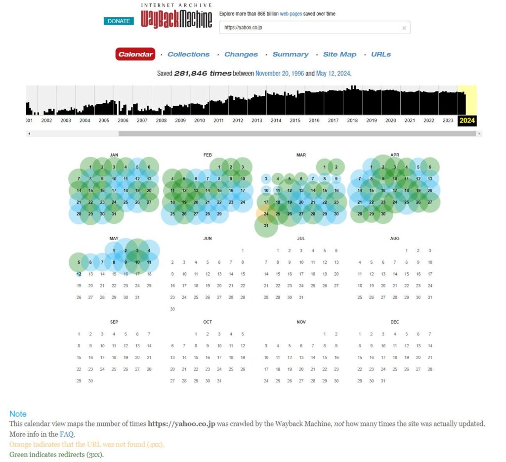調べたい年代の棒グラフをクリックすると、下段にその年のカレンダーが表示され、日付に青い円の部分がアーカイブされているところ。