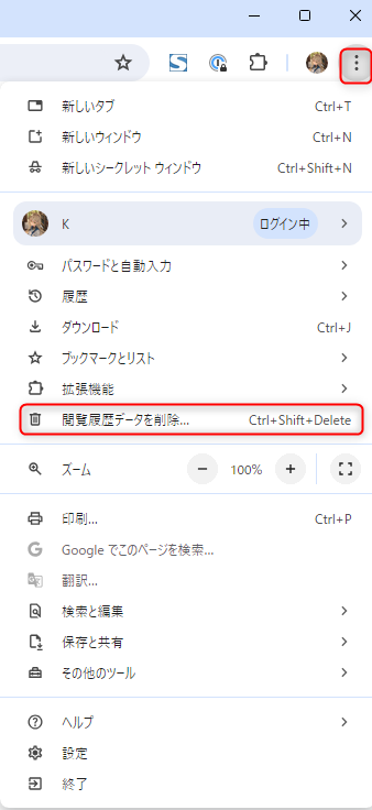 グーグルクロームの場合は右上のメニューボタンの「閲覧履歴データを削除」を選択。