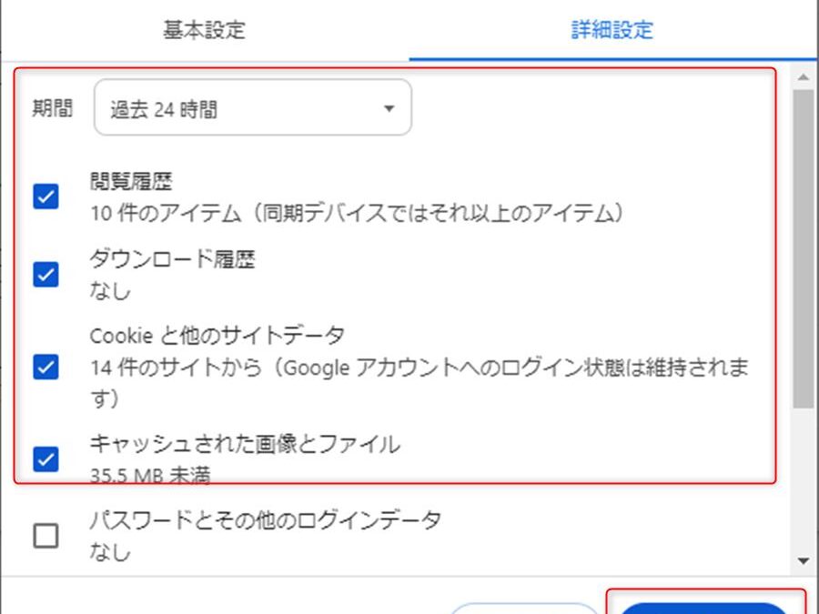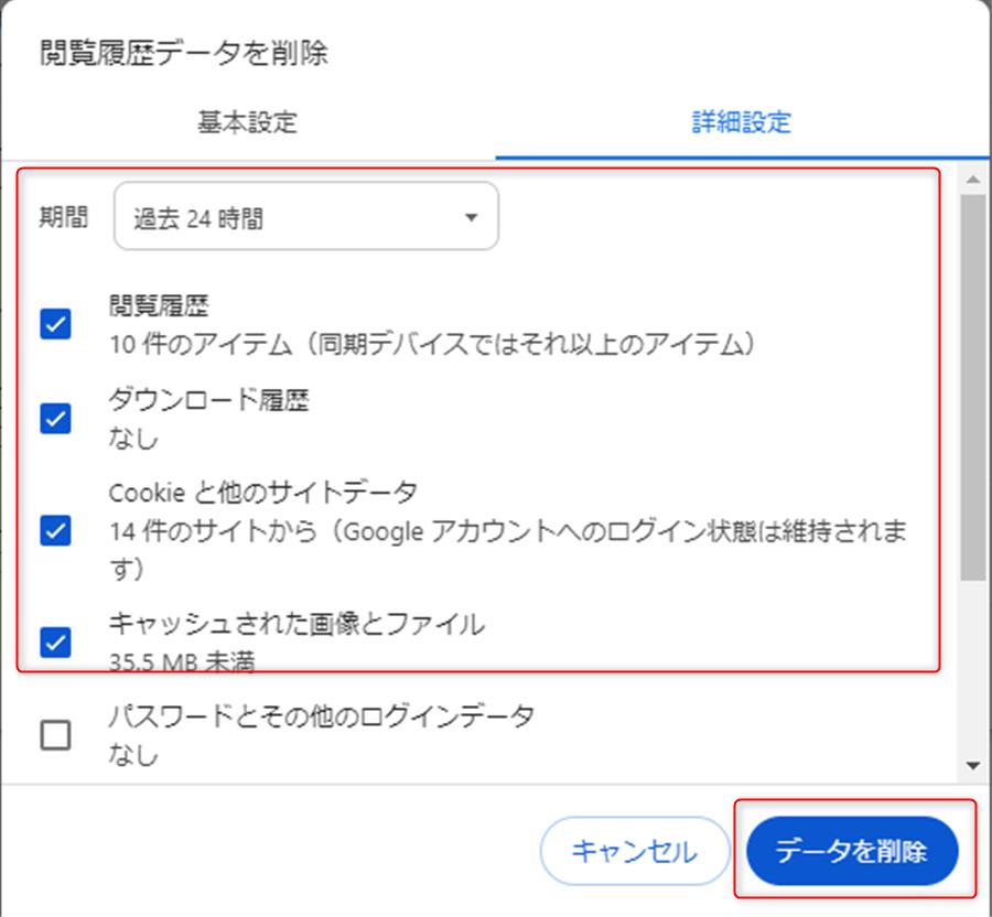 期間は「過去24時間」以上を選び、「閲覧履歴」「ダウンロード履歴」「Cookieと他のサイトデータ」「キャッシュされた画像とファイル」にチェックを入れて「データを削除」ボタンをクリックします。